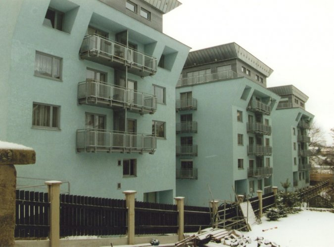 Celý komplex obsahuje dvě podlaží garáží, komerční prostory a 150 bytových jednotek (garsonky - 5+k.k.)