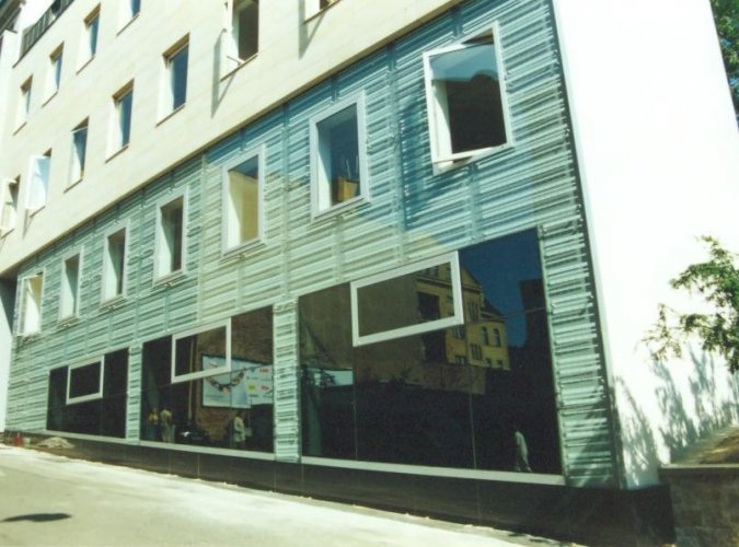 | uliční frontu tvoří skleněná zavěšená fasáda | |
